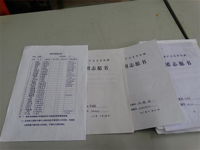 此项工作为期一个月,工作内容包含新生档案接收、新生团员证注册、遗失资料补办三部分组成。本次接收新生档案共计600余份。各班团支书根据团委的接收要求收取各班团员档案,填写由团委统一制定的团员档案登记表。再根据登记的顺序对号入座进行档案顺序的整理,然后装袋交到团委办公室。团委组织部安排专人检查整理的顺序以及表格的填写,按班归类到文件盒。最后以专业科为单位进行存档。因此,所有团员的档案信息都可以通过专业科、班级再到本人进行查找。档案的转入、转出以及时间都会做很详细的记录,防止档案遗失或者混乱。遗失资料补办我们也按照相关规定进行,凡能证明团员身份的我们才给予补办,如:持有团员证、持有档案或者持有初级中学校团委开具的相关身份证明等。