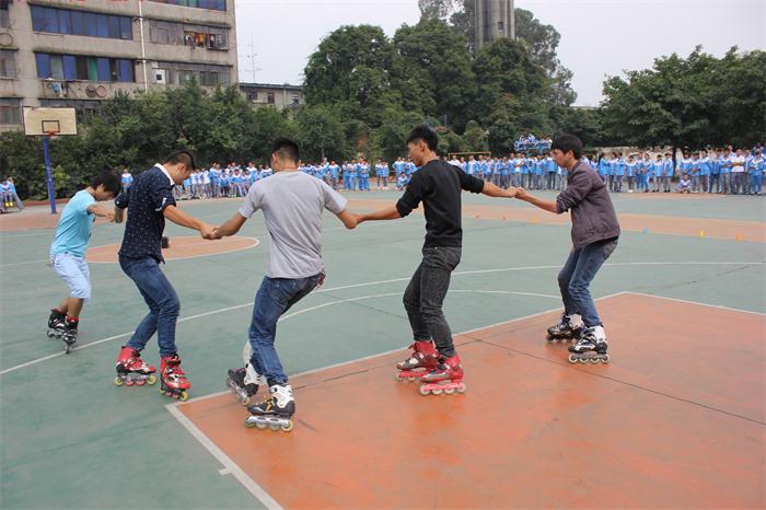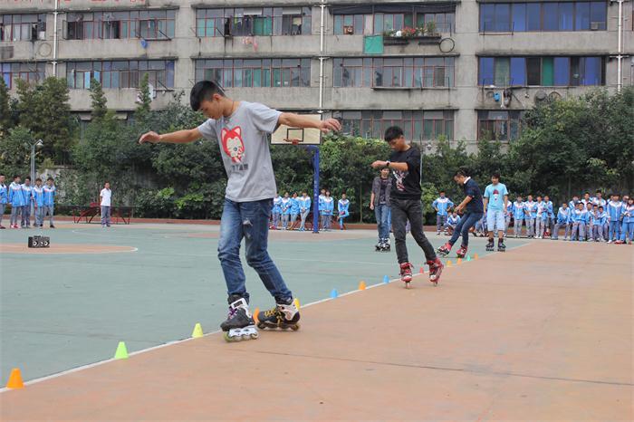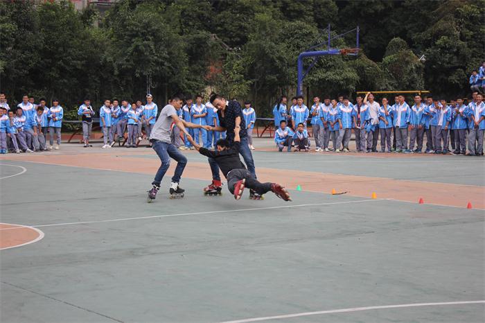 日前,我校特邀四川省AKT轮滑队高级教练、国家一级裁判、国家一级社会体育指导员刘洋和吴波等人到我校进行轮滑表演教学。