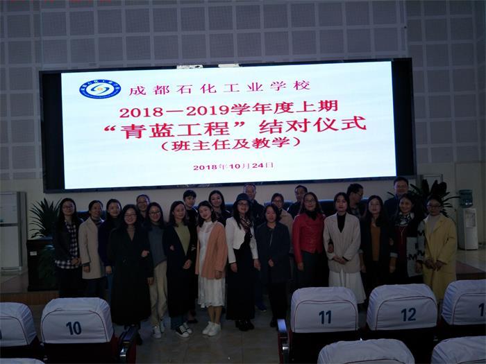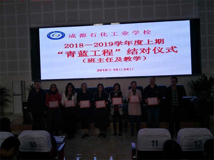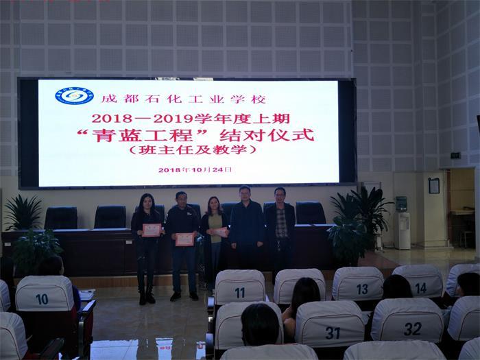 10月24日,成都石化工业学校2018-2019学年度青蓝工程结对仪式在南校区109室举行。会议由教科室主任徐志友主持,周川益副校长出席会议。