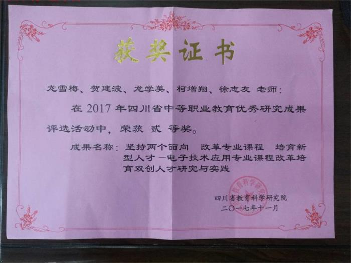 成都石化工业学校申报的《坚持两个面向? 改革专业课程? 培育新型人才——电子技术应用专业课程改革培育双创人才研究与实践》课题,由龙雪梅老师主持,贺建波、龙学美、柯增翔、徐志友等老师参研。