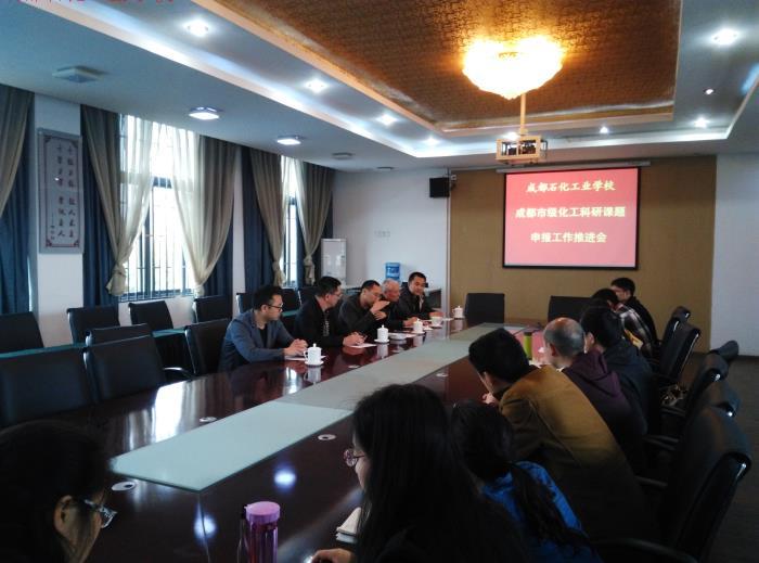 4月13日,成都石化工业学校在北校区第二会议室召开了2016年成都市化工科研课题申报工作推进会,教科室主任徐志友,副主任杨志强,化工科科长罗光宇及彭州市教研室教研员宁交顺、王涛斌老师出席会议。