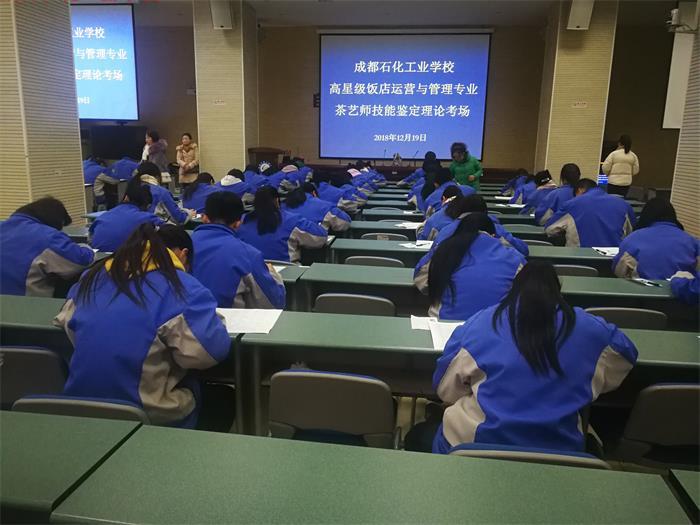 12月19日和12月25日,茶艺师职业技能鉴定理论和实操考试在成都石化工业学校南校区多功能厅和茶艺实训室顺利进行,2017级高星级饭店运营与管理专业学生参加此次鉴定考试。