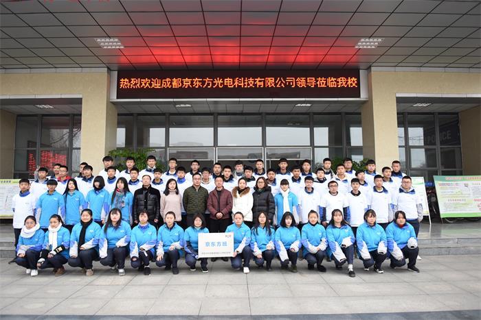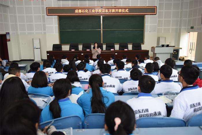 1月5日上午,成都石化工业学校在南校区109阶梯教室举行了电子科“京东方班”开班仪式。学校招就处主任、电子科、教务处、成都京东方光电科技有限公司代表制造部负责人及57名“京东方”班学生参加了开班仪式。