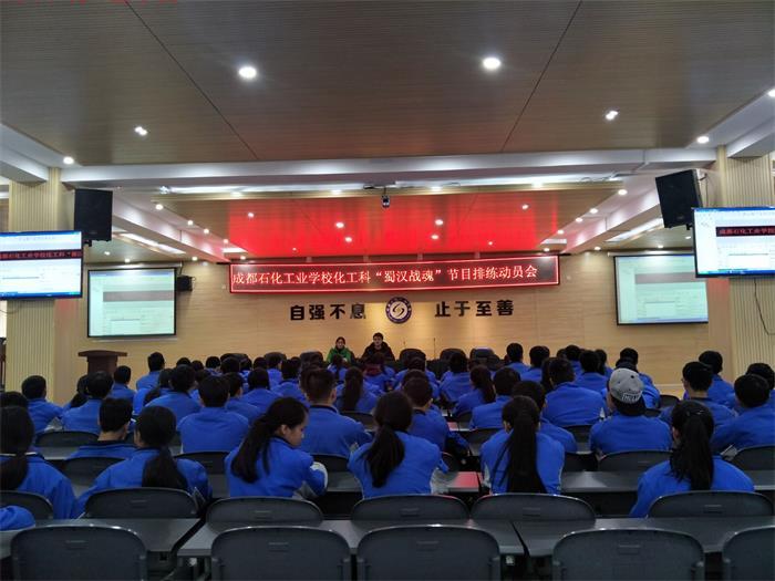 ? ?随着职教体验日的临近,我校化工科《蜀汉战魂》节目的排练也拉开了序幕。2月23下午,化工科在多功能厅召开了“蜀汉战魂”节目排练动员会?;た频掠笨瞥こ鲁霞敖谀扛涸鹄鲜Ρ骞佟⒎浇堋⒘跤瓿鱿嘶嵋?,化工科2016级参与排练的全体同学参加了本次动员会。