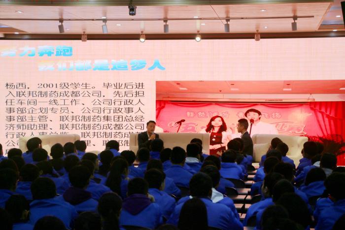 大会首先向2018级同学们介绍了两位学长的成功经历:杨西,本校2001级学生,毕业后进入联邦制药成都公司,先后担任车间一线工作、公司行政人事部企划专员、公司行政事人事部主管、联邦制药集团总经济师助理、联邦制药成都公司行政人事总监、联邦制药成都公司常务副总经理、联邦制药成都公司总经理;廖明生,本校2011级学生,现就职成都彭州优优二手车销售有限公司,担任装饰美容部经理,分管装饰美容部技术、质量、业务等工作。