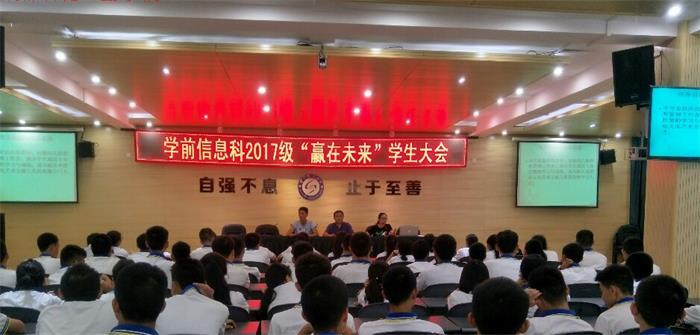 ? ?9月7日中午,成都石化工业学校学前信息科组织全体2017级新生在多功能厅召开了2017级“赢在未来”学生大会,学前信息科科长杨志强,教学副科长郑淼,德育副科长钟大林出席本次会议。