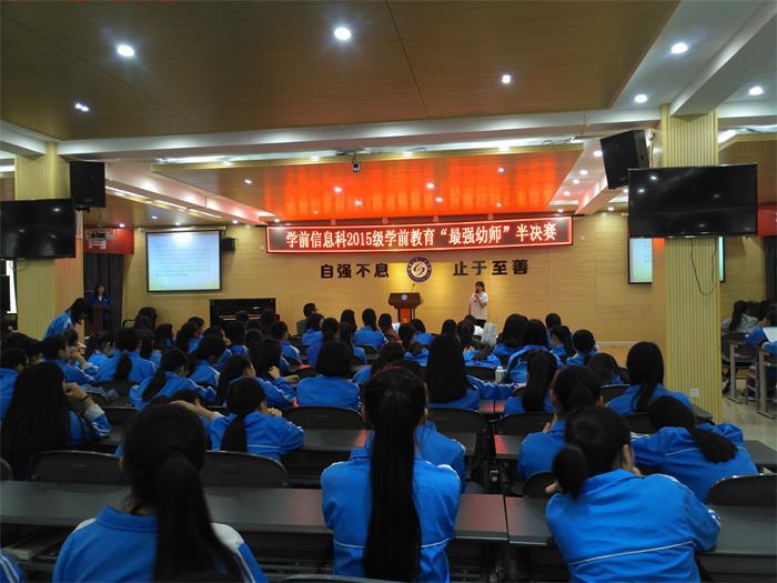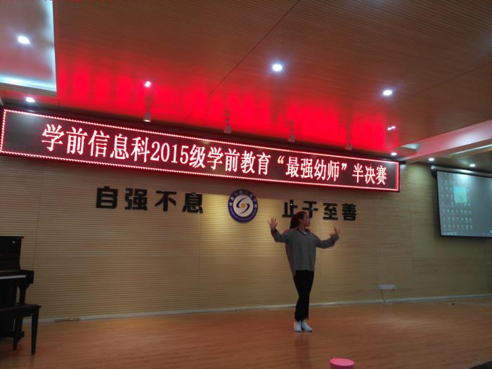 本次比赛由四名导师带领20名进入半决赛的参赛选手参加,并邀请了学前教育教研组的四位专业老师担任评委,2015级学前教育全体学生到现场观摩了比赛。比赛分为说课和才艺展示两个环节,参赛选手就自己准备的教案进行说课,然后进行才艺展示。评委根据说课的评价标准对参赛选手的说课进行打分。经过激烈的角逐,比赛最后产生了十强进入最后的决赛。