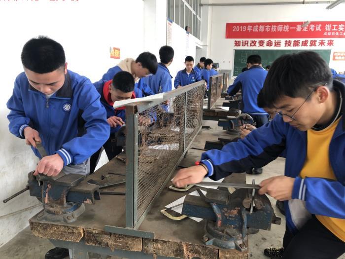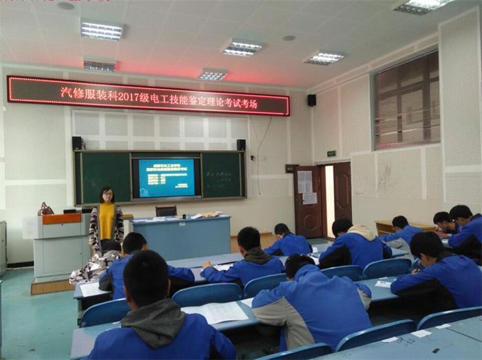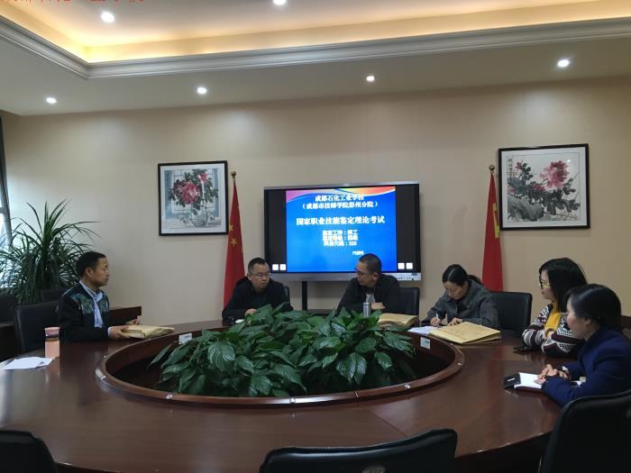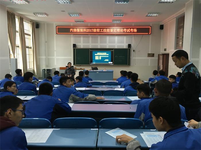 上午八点三十分,成都石化工业学校培训处主任张斌、汽修服装科科长徐志友、汽修服装科副科长赵凤玲以及汽修服装科监考老师在学校会议室召开考务工作会议。在会议中,张斌着重讲解了本次技能考试应把安全放在第一位,赵凤玲主要对本次考试的时间安排及对监考员分工进行了详细安排。上午九点十分开始,分别对焊工、钳工、电工三种工种进行了技能理论考试,学生认真有序地答题,监考员认真负责监考。下午一点半开始,专业科认真组织2017级汽修专业各班分赴机械实训中心、电子实训中心参加技能实操考试,班主任认真维持学生考试纪律和保障学生考试安全,监考老师有序、严肃安排学生技能考试。