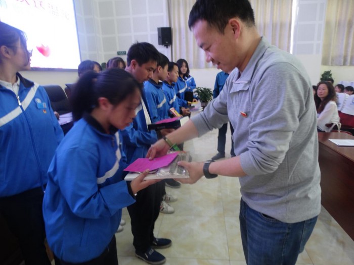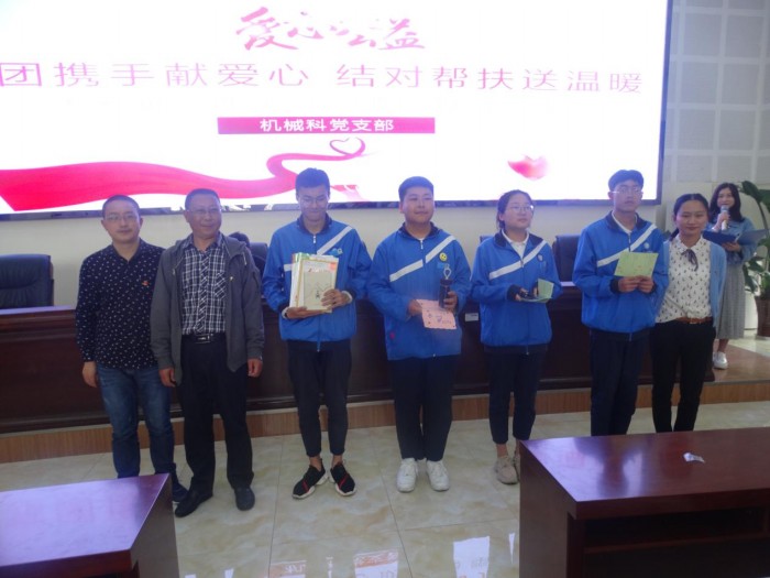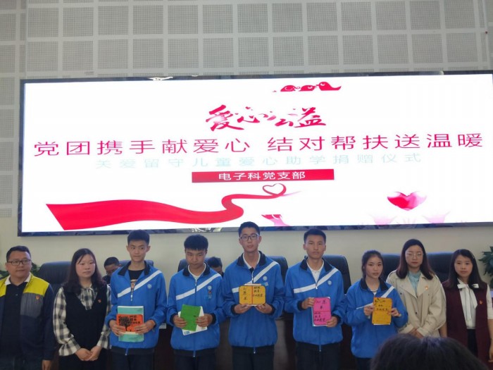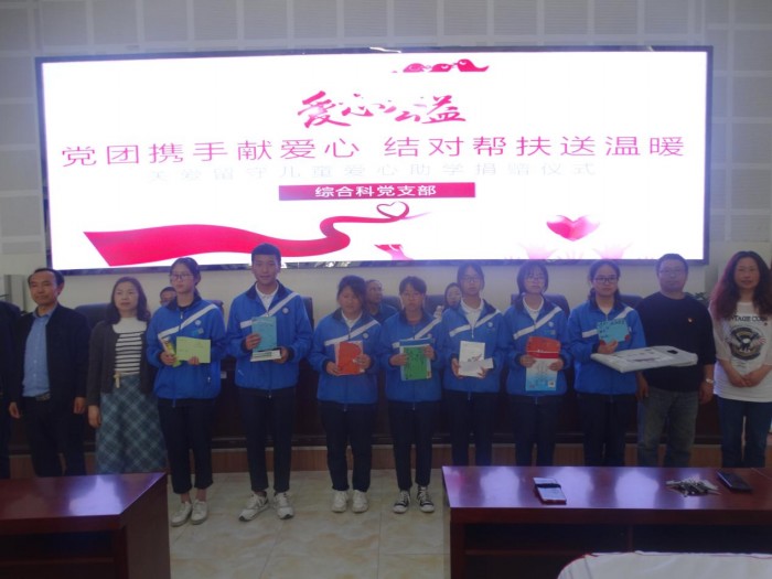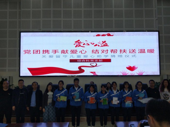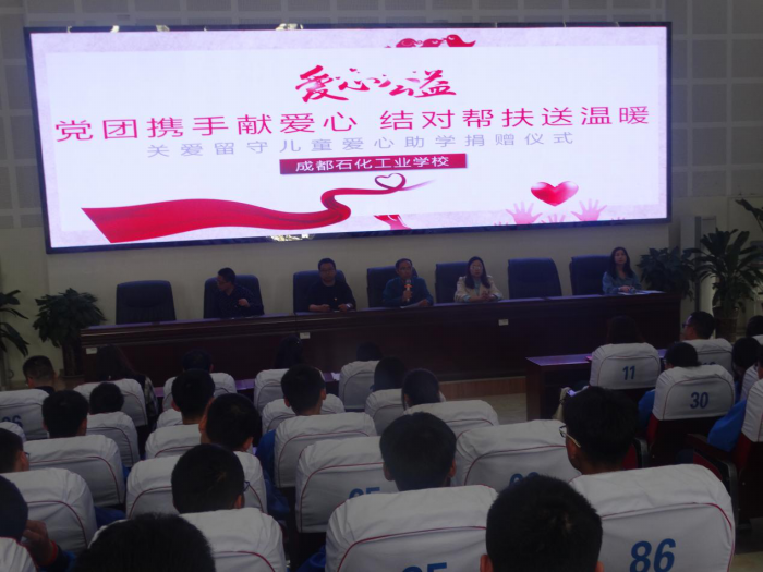 4月18日中午13:00,由学校党委主办,校团委承办的成都石化工业学校“关爱留守儿童,爱心助学捐赠”仪式在南校区第一会议室成功举行,出席本次捐赠仪式的领导有成都石化工业学校党委办主任、汽服科支部书记左茂云 、各支部书记、部分党员代表、学生代表及受捐助的学生。