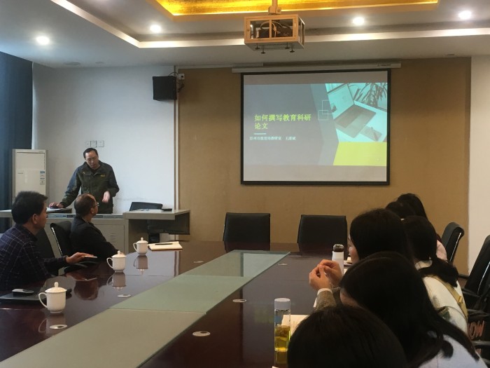会上,刘遵勇在致辞中对参会嘉宾表示欢迎和感谢,郑淼对名师工作室整体情况及课题研究进度进项简单说明,肖安华就名师工作室“名在哪?”为主题对名师工作室未来的建设和发展提出了意见。最后,王涛斌围绕“如何撰写教育科研论文”进行了讲解,并就名师工作室目前课题研究内容进行了切实有效的指导。