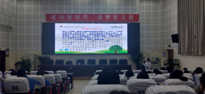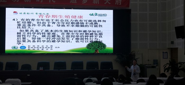 当天,彭州市妇幼保健计划生育服务中心乐洋、李晓平,陈钰医生一行来成都石化工业学校,针对男生,女生青春期的保健知识各进行一场青春期健康知识讲座。李小平从青春期生殖健康,无保护的性行为可导致的多种伤害,讲到了我国艾滋病的情况,并深入浅出的给女同学讲到怎样避免性骚扰、性侵害。乐洋医生给男同学们讲解了青春期男生遇到的问题以及艾滋病的防治。两位医生的讲座图文并茂,气氛高潮迭起,良性互动的氛围带动全场的气氛。