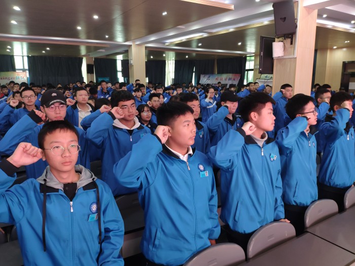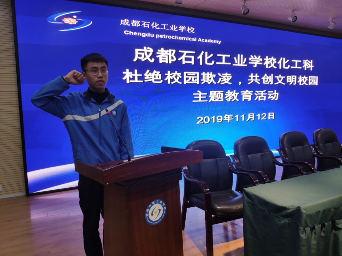 最后,2018级工分1班徐肖庆同学带领全体同学宣誓:争做石化文明学子,谨守道德底线,自觉遵纪守法,严于律己,宽以待人,拒绝校园欺凌。