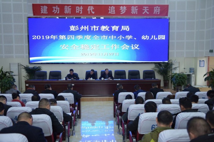 2019年11月27日,彭州市教育局2019年第四季度全市中小学幼儿园安全稳定工作会议在我校第一会议室召开。彭州市教育局副局长周义,德保科科长蔡敏,德??仆醭舾毙3?,以及全市各学校的安全工作负责人近百人参加了会议。
