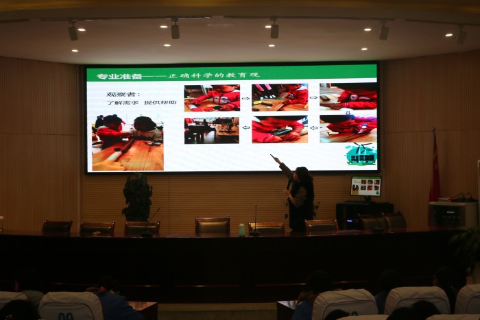 何园长向同学们分享的第一点是“角色的转变”,希望同学们从走进幼儿园的那一刻,不管是参观还是见习,都要把自己当做一名老师,而不再是学生。何园长指出,除了身份的转换,要想成为一名合格的幼儿园老师,还要有“四心”——耐心、爱心、细心、责任心,科学、正确的教育观,以及扎实的基本功。她通过分享一个个生动、真实地案列,让大家对幼儿园老师所要具备的专业素质和专业技能有了更加直观的了解,也感受到了她对幼教事业的一片赤子之心。