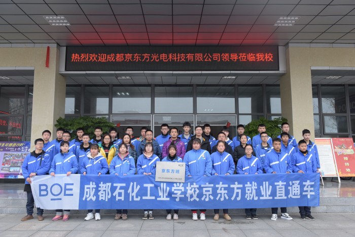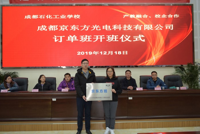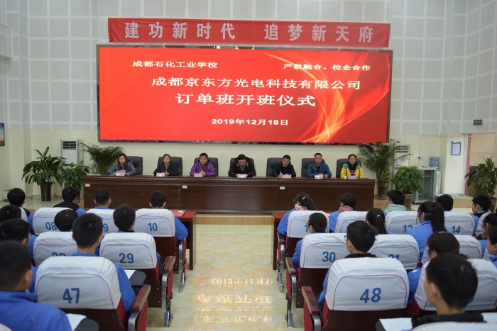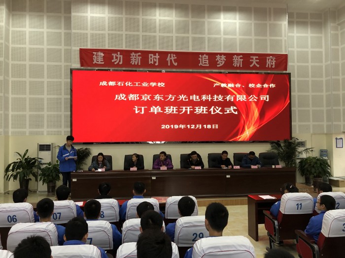 12月18日上午,成都石化工业学校电子技术应用专业2018级“京东方班”开班仪式隆重举行。学校招就处主任杨旭、副主任龙学美、电子科科长黄尹翔、京东方光电科技有限公司西南招聘部经理王子涵、B2制造部科长王聃、成都京东方B2HRBP经理周玉巧以及30名2018级“京东方班”学生参加了开班仪式。