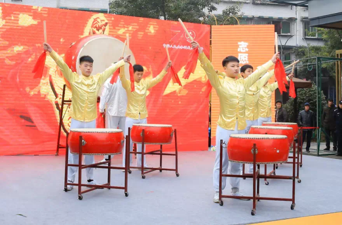日前,成都石化工业学校汽服科威风旗鼓队24名队员表演的《鼓舞》参加在望蜀里举办的彭州市首届社区邻里节暨社区志愿服务周启动仪式,得到了现场居民的阵阵喝彩。