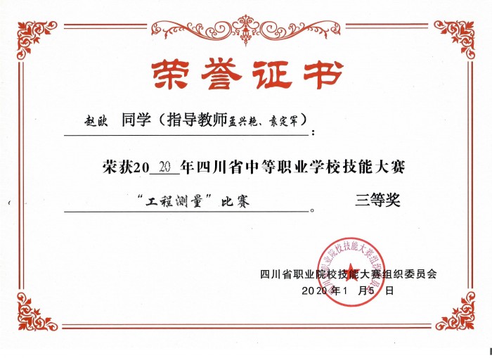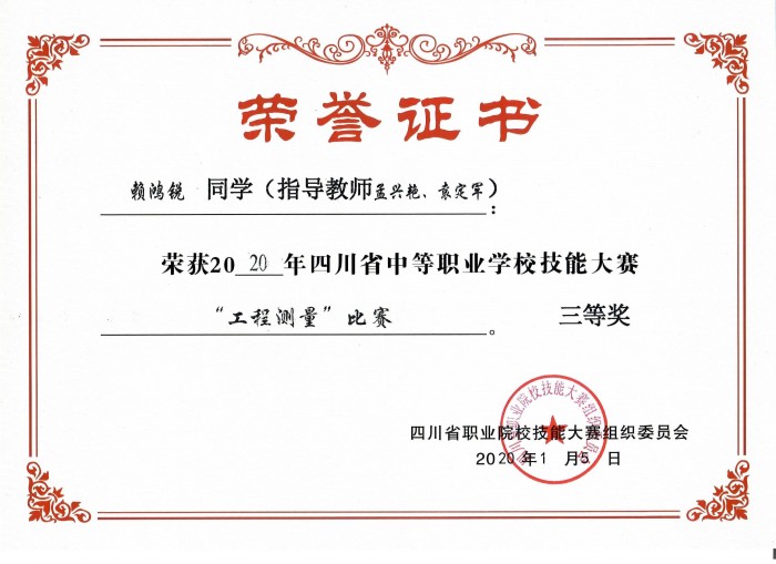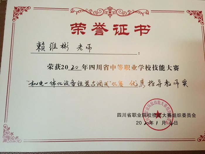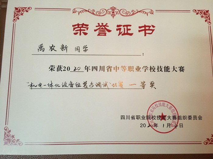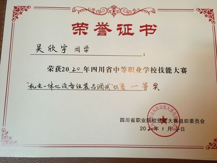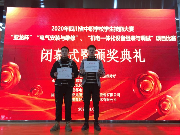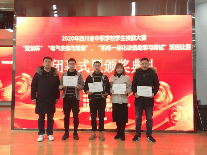 1月4日,在成都电子信息学校举行的机电一体化设备组装与调试赛项中,吴欣宇和禹农新历经4小时激烈角逐,以第一名的优异成绩斩获一等奖,顺利取得参加2020年全国职业院校技能大赛的参赛入场券;在成都市工业职业技术学校举行的建筑工程测量比赛中,赖鸿锐,刘义骥,王李科,赵欧四名选手团结协作,熟练操作,圆满完成测量任务,获等三等奖。