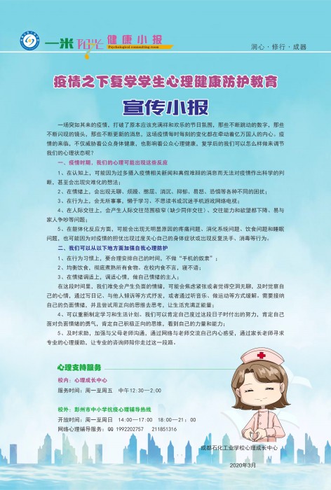 学校心理成长中心将依据测试结果为有需求的学生提供专业的心理个辅、团辅,帮助他们解决心理困扰。同时,心理成长中心制作了心理健康宣传小报,为学生心理健康知识,校内外心理辅导热线,学校将通过多种形式,让他们顺利度过疫情阶段,以最好的心理状态迎接高考。