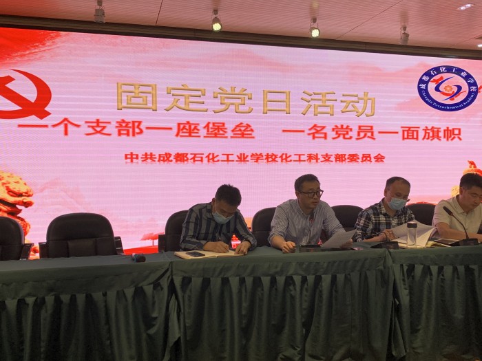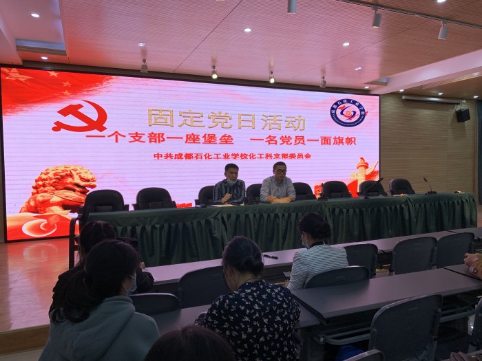 4月26日,中共成都石化工业学校化工科支部在北校区多功能厅组织支部全体党员开展了固定党日活动,活动由支部书记邝瑶同志主持。校党委委员罗光宇出席活动。