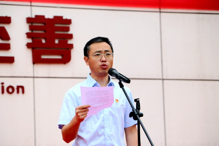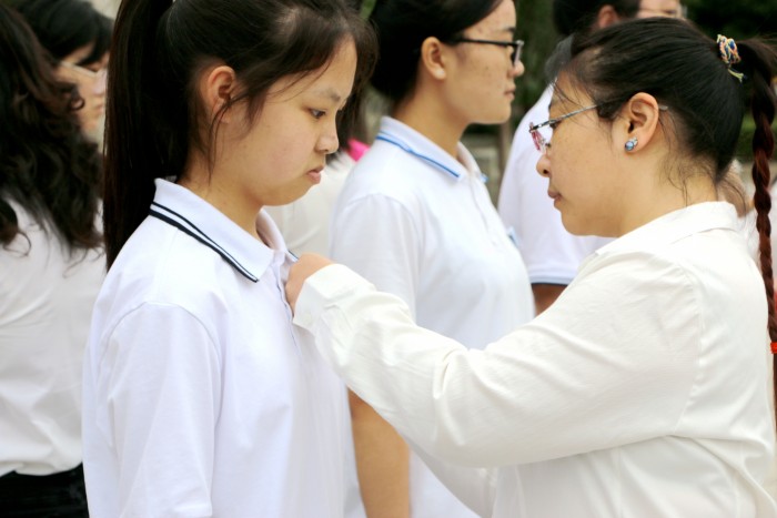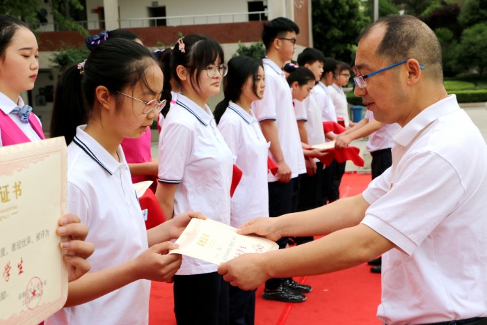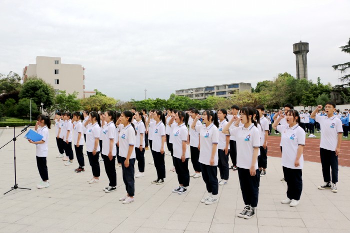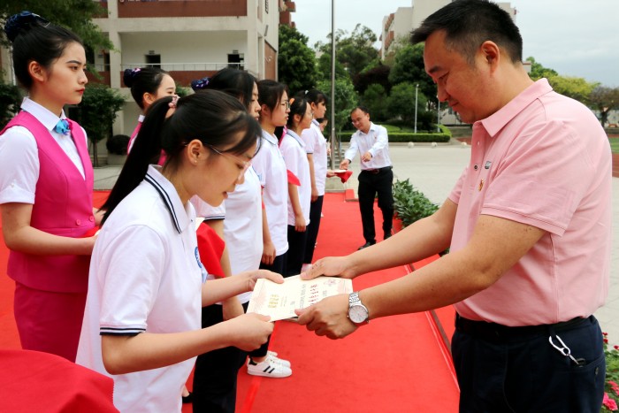 入团宣誓仪式上,第十八期团校结业的63名优秀学员代表,步伐整齐、精神抖擞的进入运动场,在大家的见证下,党员教师代表为他们佩戴了团徽,体现了我校党团共建的深刻含义。南校区2019汽修二班宋方强同学、北校区2019级学前教育5班席孔蓉同学带领大家面向团旗庄严宣誓,重温入团誓词,齐唱团歌,全体同学接受了一次严肃而庄重的爱国主义教育,增强了青年团员的使命感和责任感。党委青年委员、副校长罗光宇向新团员代表寄语三点希望,一要心态阳光,二要牢记责任,三要弘扬工匠精神,全校青年学生要铭记习总书记的讲话精神,肩负一代人的使命,走好一代人的长征路。