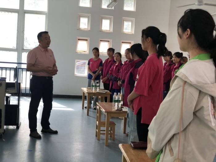 培训开始前,丹景山中心幼儿园园长介绍了主讲老师和参培人员;文翁丹景学校校长张昌波用“欢迎、感谢、友谊”三个关键词表达了他的想法和期望?!坝资ι殖沙ぶ贰迸嘌翟谟淇斓摹缎腋E氖指琛分欣蚰?,主讲老师杨志强引导大家从气息练习、发声练习开始,结合幼儿园老师们喜欢的儿歌和流行歌曲详细讲解,教学团队示范了不同类型的歌曲的发声技巧,并带领大家进行练习。