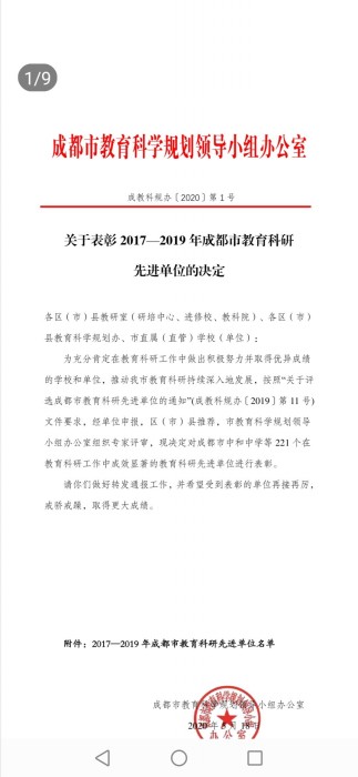 这次评选活动,是在成都市教育科研规划领导小组办公室的领导下,按照“关于评选成都市教育科研先进单位的通知”(成教科规办〔2019〕第 11 号) 文件要求,经单位申报,区(市)县推荐,市教育科学规划领导小组办公室组织专家评审。凭借自身的科研实力和学校领导的重视,成都石化工业学校在众多的竞选学校中脱颖而出,成为彭州市荣获这一殊荣的几所学校之一。