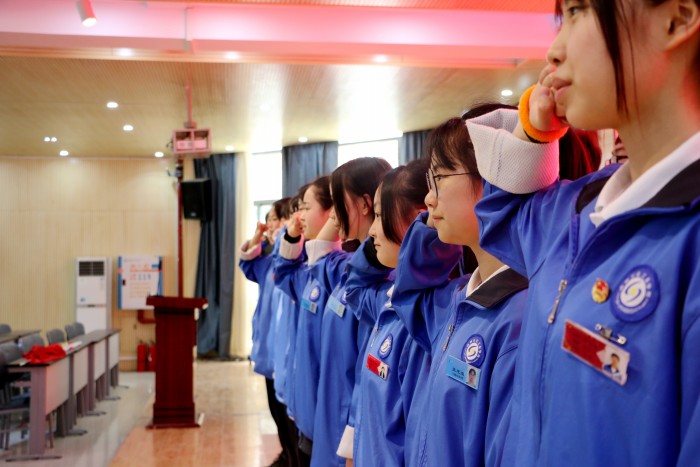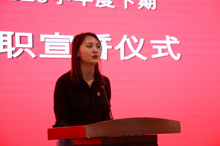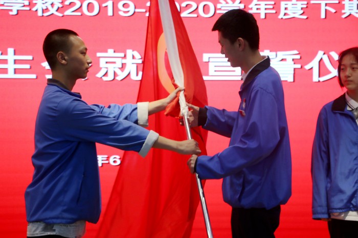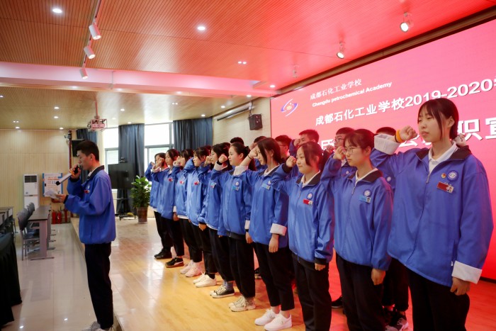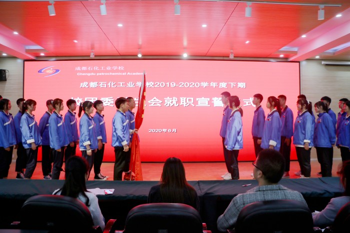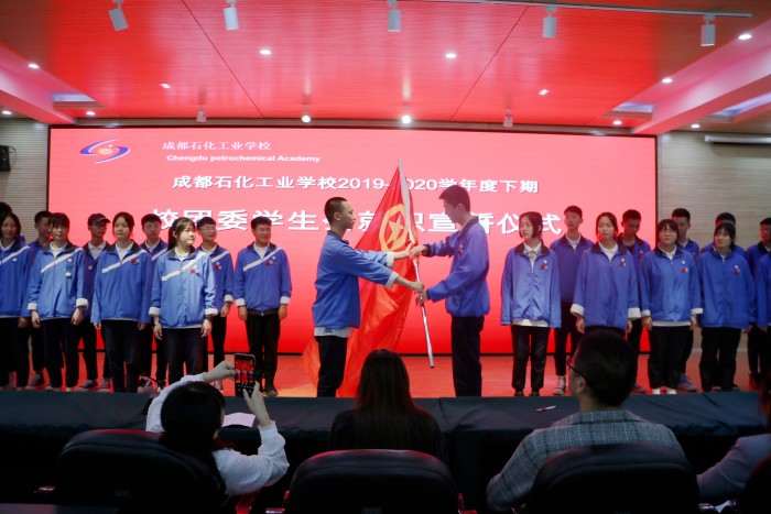 仪式上,政教处负责人宣读了新一届学生干部的任职名单,新一届学生干部全部来自2019级各专业、各班,均通过近一年的工作历练。通过前期的申请报名、就职演讲、民意调查、教师考核等环节层层筛选,最终获聘为学校新一届学生干部。政教处负责人也对新聘学生干部提出了殷切的期望,希望他们尽职尽责,率先垂范;乐于奉献,勇担重任;创新工作方法,艺术开展工作。仪式上,校团委还未即将离任的学生干部颁发了荣誉证书,感谢他们在自己的岗位上为石化学校作出的贡献。最后举行了就职宣誓仪式。2018级校学生会主席手捧会旗,带领全体离任学生干部迈着整齐的步伐走上主席台,将手中鲜艳的会旗交到了新一届学生会主席手中。交接的不仅是一份责任,更传递的一份担当、奉献、向上向善的精神。2019级全体学生干部面向团旗庄严宣誓,句句铿锵有力,誓言燃烧自己的青春,贡献自己的力量。