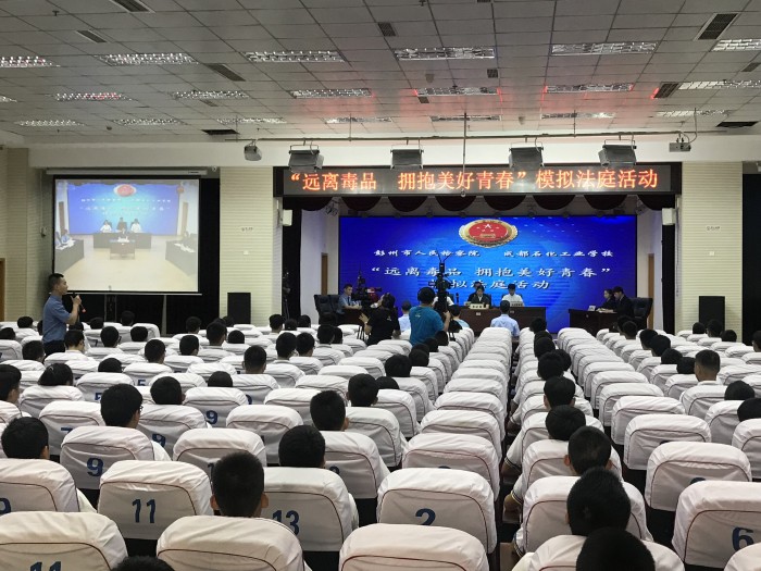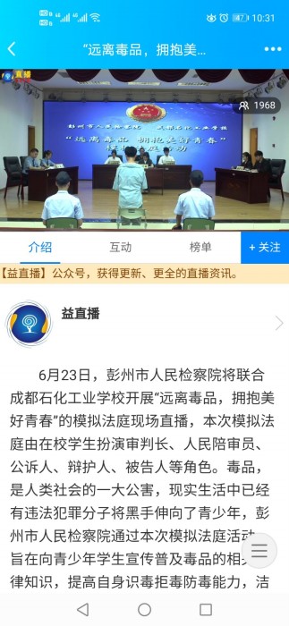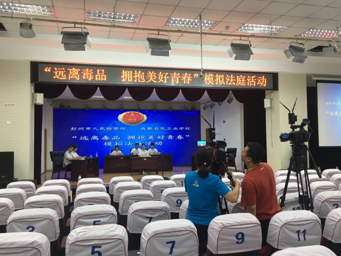 为配合6.26国际禁毒日宣传教育,进一步增强学生法律意识,6月23日,彭州市检察院打破了以往较为单一的校园普法宣传形式,在成都石化工业学??沽恕霸独攵酒? 拥抱美好青春”模拟法庭直播活动。