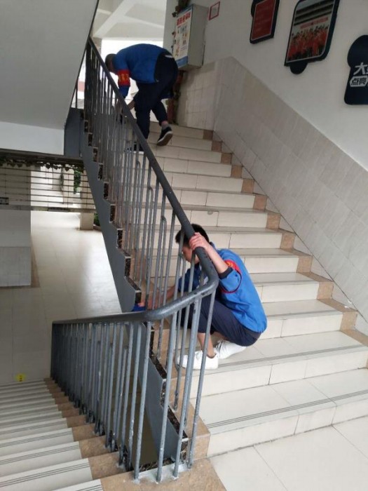 同学们用工具将校园内所有楼道的蜘蛛网全部打扫干净。