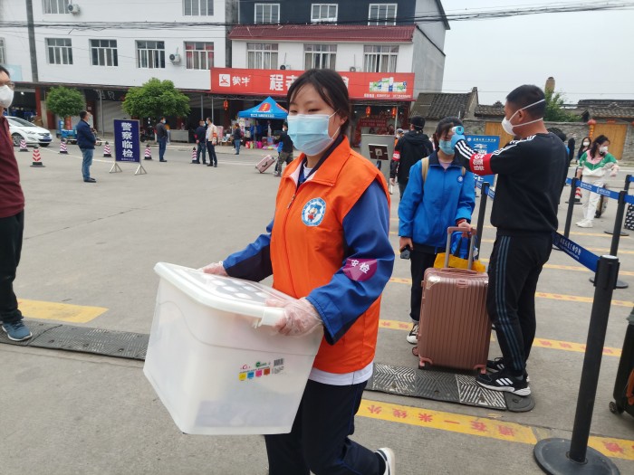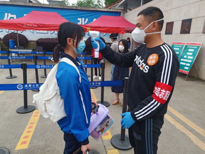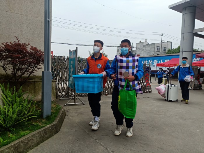我校学生在现场工作人员的指引下,保持间隔1米排队候检,出示天府健康码(绿码)然后依次核验身份,接受体温检测,学校在校门口分出了四个学生专用通道,设置了男女生专用安检区,专人负责,有序组织学生测温、行李消毒、入校,现场秩序井然。党员志愿者、青年学生志愿者和教职工化身复课一线的“搬运工”,助力同学们复学复课。校门口细心严谨的警察、医生,早已等候多时的班主任、久别重逢的同学好友,还有那绿草茵茵的操场、久违的餐厅、公寓和教室……