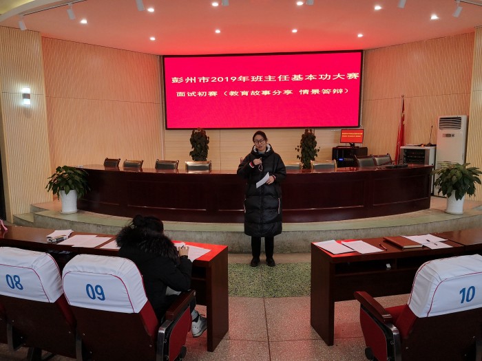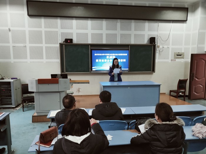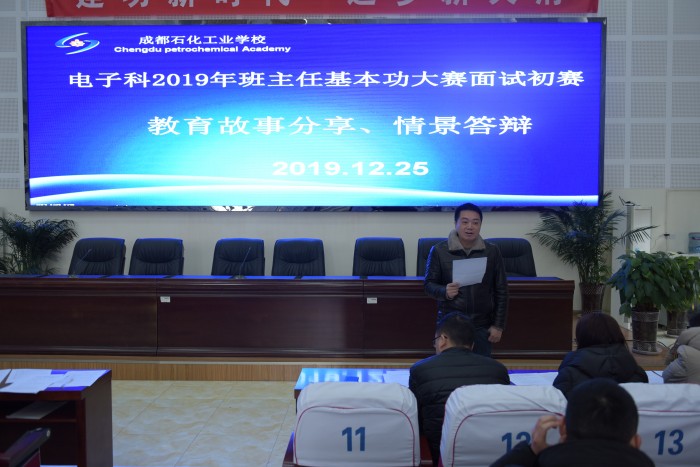 1月2日上午9点,成都石化工业学校2019年中职班主任基本功大赛决赛暨彭州市2019年中职班主任基本功大赛决赛在学校南校区第四会议室举行。决赛由成都市教科院教研员刘巍、彭州市教育局教研室教研员肖安华担任专家评审,学校教科室、政教处、各专业科代表共同组成评审小组。