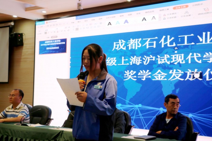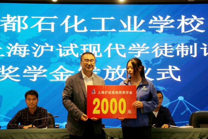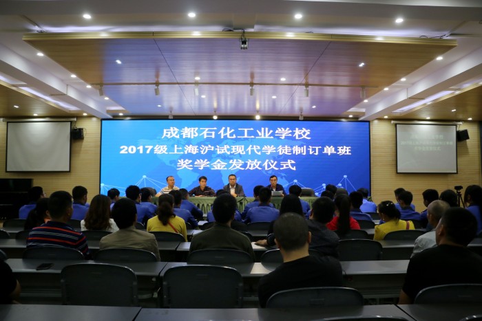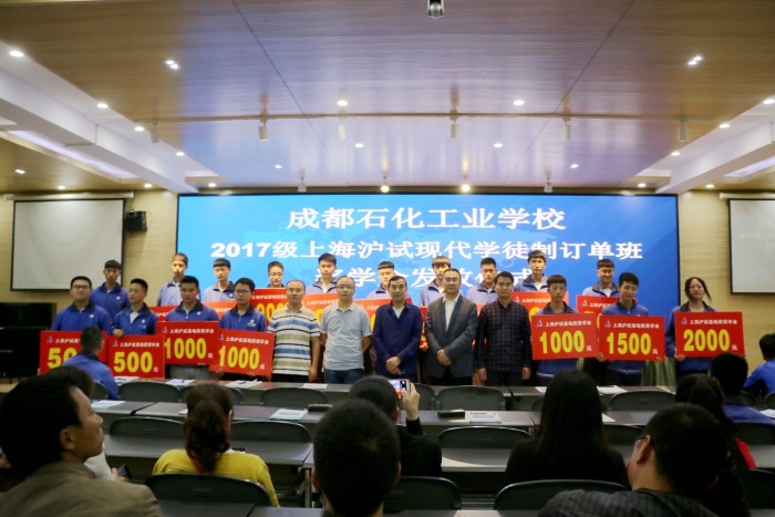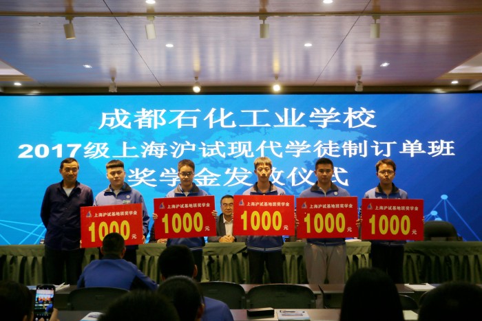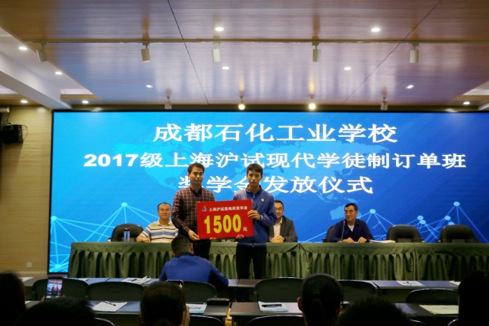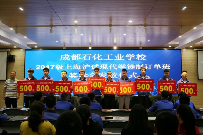 据悉,本次上海沪试奖学金共计13500元,奖励学生17名。本次奖学金颁奖仪式是成都石化工业学校与上?;κ越行F蠛献?、产教深度融合的成功体现。