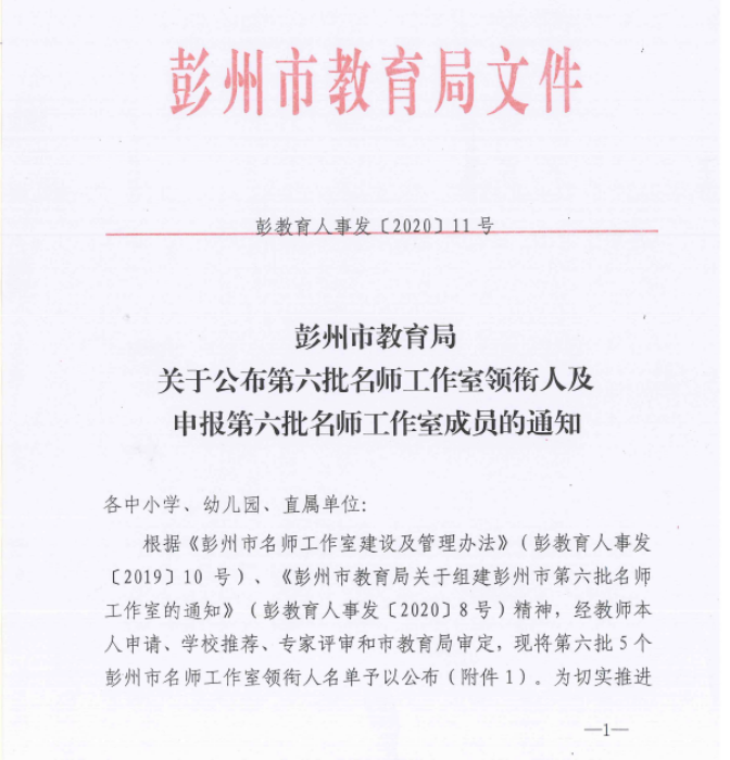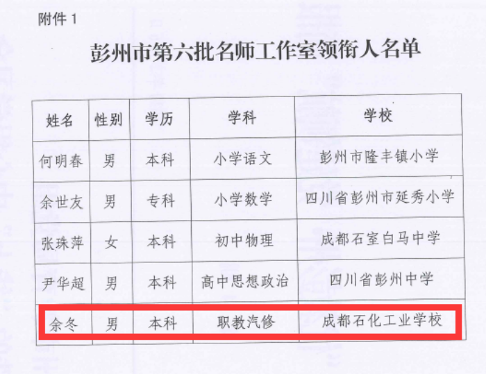 根据《彭州市教育局关于组建彭州市第六批名师工作室的通知》(彭教育人事发[2020]8号)精神,我校积极组织相关教师申报名师工作室,最终通过本人申请、学校推荐、专家评审和教育局审定,6月4日,我校汽车专业余冬名师工作室建设项目获批。