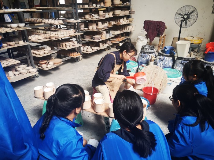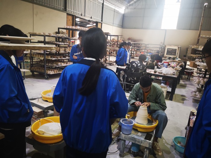 学员们在老师的带领下参观了陶艺达人作品展览室,对每样作品都融入天府文化而感到惊叹,看似简单的外表,其实蕴含着四川天府的竹子、荷花、熊猫等设计元素,令彭州白瓷名副其实。接着依次参观各个工艺仓库,见识了陶瓷从原料到成品上釉的工序,陶艺班管理老师何瀚月老师重点向同学们介绍了其中三名手艺人,分别是来自2016级计算机专业的刘汉文(精修胚)、钱林东(精塑形)以及2016级学前教育专业的陈昱琳(精釉色),他们曾经都是第一期陶工户文创班的学生,毕业后毅然选择留在陶工户当学徒,增强技艺、共谋发展。