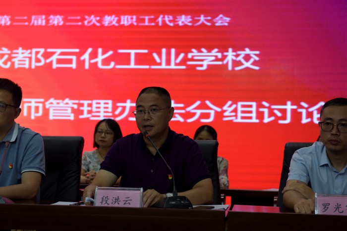 第六项议程,审议报告,分组讨论《成都石化工业学校中小学高级教师管理办法(草案)》,听取各小组审议意见,代表们积极参与,讨论热烈,彰显了民主活力。
