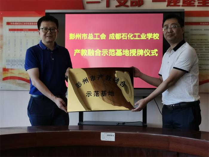 8月24日,成都石化工业学校被彭州市总工会授予了“彭州市产教融合示范基地”称号。彭州市总工会经审委主任武斌、彭州市总工会陈杰、教育局工会主席廖秀军、成都石化工业学校校长周川益参加授牌仪式。