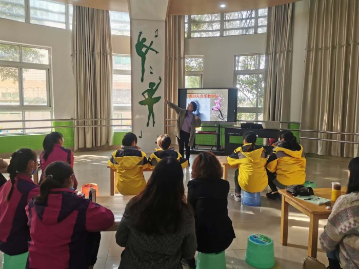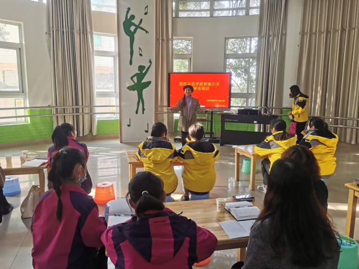 培训共发两个环节。第一环节,张岚老师从奥尔夫的背景入手,介绍了奥尔夫教学法的基本理念、教学目标、教学特色以及如何将奥尔夫音乐运用到课堂教学中,让老师们了解如何从语言、节奏、肢体运用、乐理知识的融入以及音乐素养的培养进行奥尔夫音乐教学。第二环节,张岚老师通过奥尔夫游戏活动小跳蚤、找奶嘴、找国王、节奏游戏让老师们在游戏中体验了奥尔夫音乐游戏的乐趣、理念和基本操作方法。