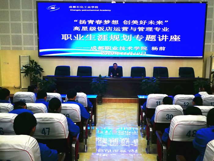 为帮助学生了解所学专业及就业前景,了解职业生涯规划的重要性,11月19日上午,成都石化工业学校综合科邀请成都职业技术学院专家杨前老师,在南校区109会议室作了场主题为“扬青春梦想 创美好未来”的职业生涯规划专题,高星级饭店运营与管理专业一、二年级150余名学生参加了此次讲座。