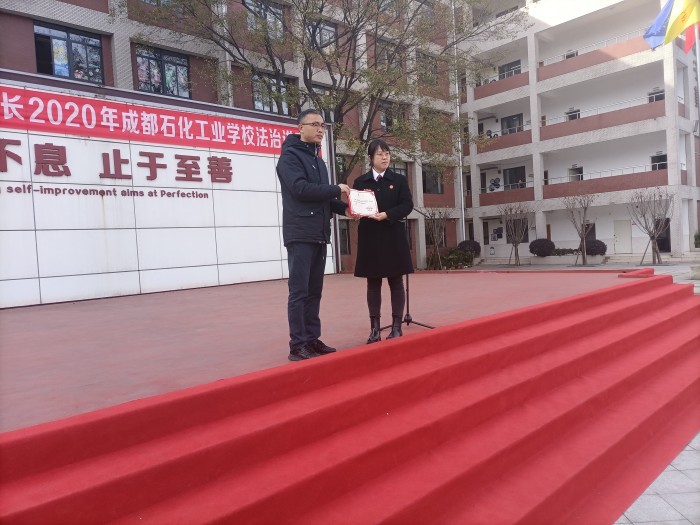 为落实《彭州市人民法院、彭州市教育局“护苗”行动的协作意见》,推进法院参与中小学法治建设和青少年学生法治教育,日前,成都石化工业学校邀请法治副校长、彭州市人民法院熊熠法官到学校开展法治专题讲座。学校党委委员、副校长罗光宇为熊熠法官颁发了法治副校长聘书。