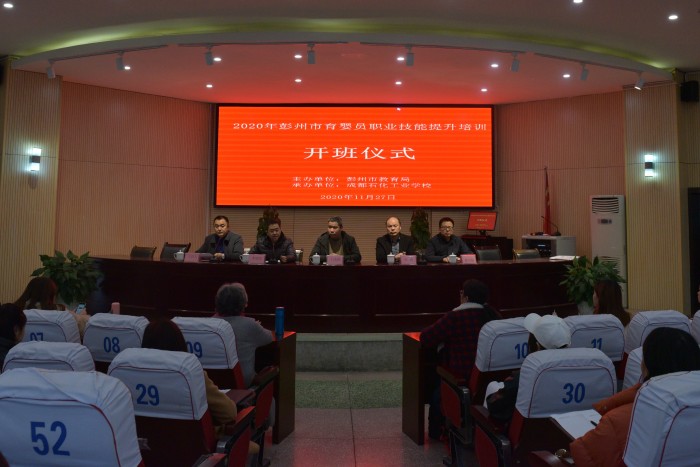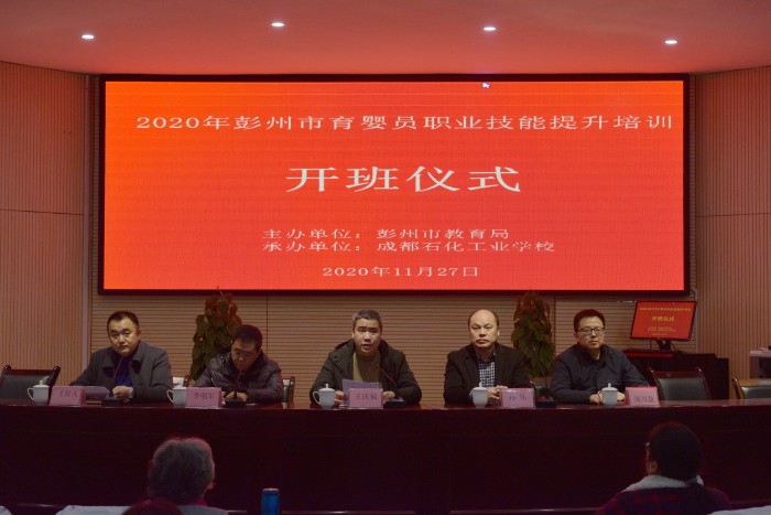 由彭州市教育局主办,成都石化工业学校幼儿保育专业承办的“2020年彭州市育婴员职业技能提升培训”于11月27日至29日在成都石化工业学校北校区成功举行。彭州市教育局副局长、党组成员王庆福,教育局、卫健局相关科室负责人、成都石化工业学校校长周川益出席了培训班开班仪式。