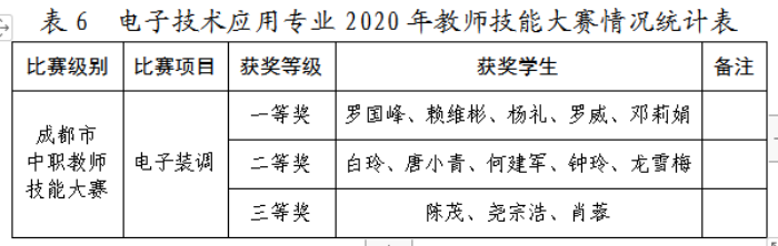 学生的成绩和专业建设的成果离不开老师们的辛苦付出,我校电子技术应用专业17名专业课教师在繁重的工作之余不断学习,苦练技能,相互切磋,积极参加专业教师技能竞赛,在11月27日举行的成都市中等职业学校师生技能大赛电子装调赛项(教师组)中,荣获5个一等奖、5个二等奖和3个三等奖,综合获奖情况位列成都市第一,再次展示了我校教师过硬的专业技能水平。
