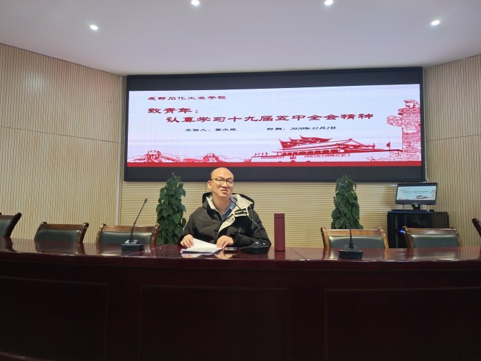 为深入贯彻落实共青团中央印发的《关于认真学习贯彻党的十九届五中全会精神的通知》文件要求,引导团员青年坚定理想信念,传承红色基因,持续深化爱国主义教育,勇担时代责任,做可担大任的新时代青年,近日,成都石化工业学校团委开展以“薪火相传担使命 凝心聚力谱新篇”为主题的十九届五中全会精神主题团日活动。学校政教处主任、校团委书记蒙小建作专题辅导,校团委副书记、团委委员、第十九期团校培训班全体学员参加了主题团日活动。