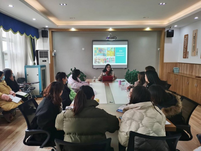 杨老师通过儿歌《小星星》、《国旗国旗真美丽》等带领老师们深入感知短音、长音、连音、跳音等发声方式,并带领老师们进行发音练习。陈老师以美术理论与实践相结合,示范和讲解相结合的方式,围绕幼儿园环境创设进行了细致讲解。在声乐、环创的培训过程中,老师们积极参与、大胆表现,充分发掘自己的艺术潜能。