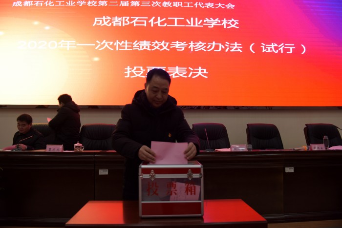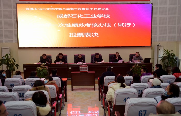 第四项议程,全体代表进行票决,审议通过《成都石化工业学校2020年一次性绩效考核办法(试行)讨论稿》