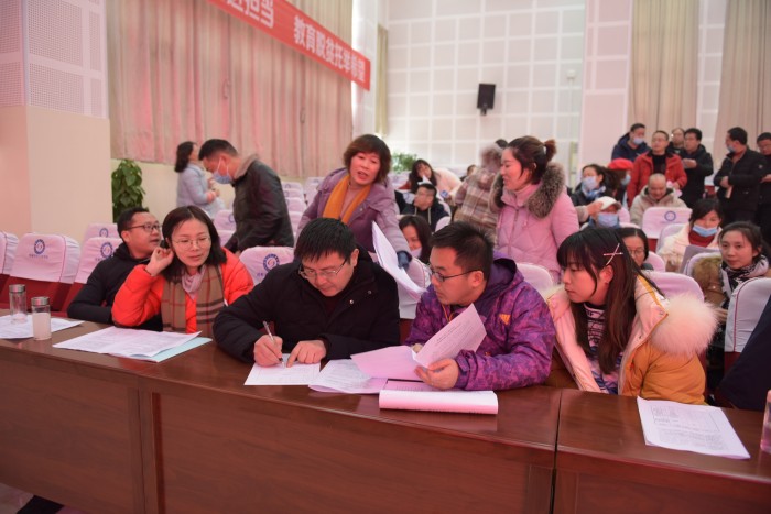 第五项议程,民主评议学校行政干部,各位代表对学校行政干部的德、能、勤、绩进行了综合评议。