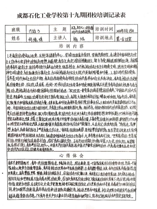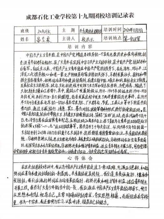 本期团校培训历经一个月的学习、考核,先后邀请了学校党委、党支部书记为团校学员授课。校党委副书记段洪云讲授第一讲《中国共青团的关辉历程》,化工科支部书记邝瑶、综合科支部书记张孝剑讲授第二讲《解读中国共青团章程》,学前信息科支部书记杨旭讲授第三讲《做新时代合格团员》,并且学员们还共同观看了爱国主义影片《我和我的祖国》,参与了校内志愿服务活动,最后通过结业考试顺利结业。