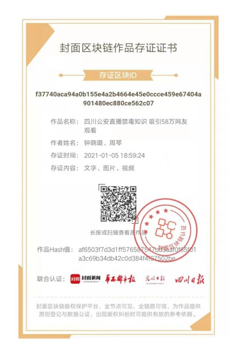 据悉,本次活动直播的同时,彭州市教育局组织全市万余名学生通过教室多媒体参加活动,并在直播平台留言,旨在让同学们能够将禁毒知识、安全知识牢记于心,谨记于行,将禁毒、安全教育融入每个人心中,共同构建平安、和谐、健康的成长环境。彭州电视台以“有趣、有料、有创新,这场禁毒预防教育活动不一般”为标题,对本次活动进行了全面报道。据封面区块链作品存证证书显示,本次活动网络直播吸引了58万网友观看,活动宣传效果显而易见。