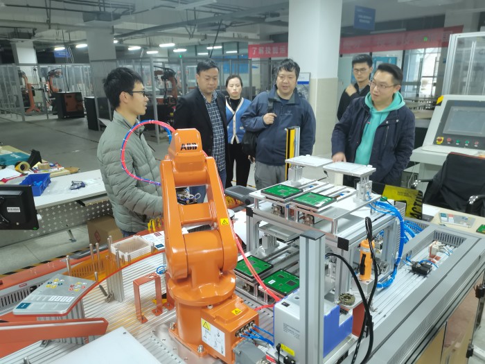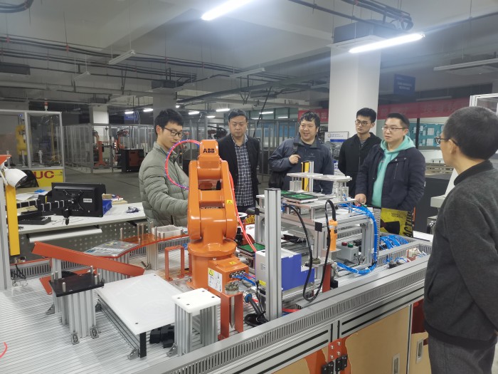 会后,周皇卫及技术部负责人带领老师们实地参观了工业机器人实训中心,对KUKA工业机器人实训系统、基本操作、搬运码垛系统应用进行真实体验。