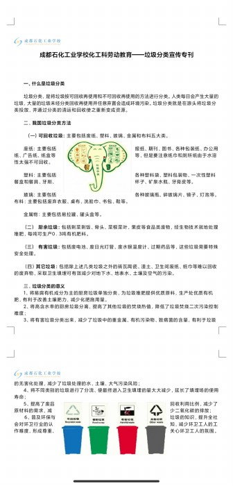 为切实增强学生对垃圾分类知识的了解,提高学生环保意识,助力劳动教育,日前,成都石化工业学校化工科开展了垃圾分类志愿宣传活动。