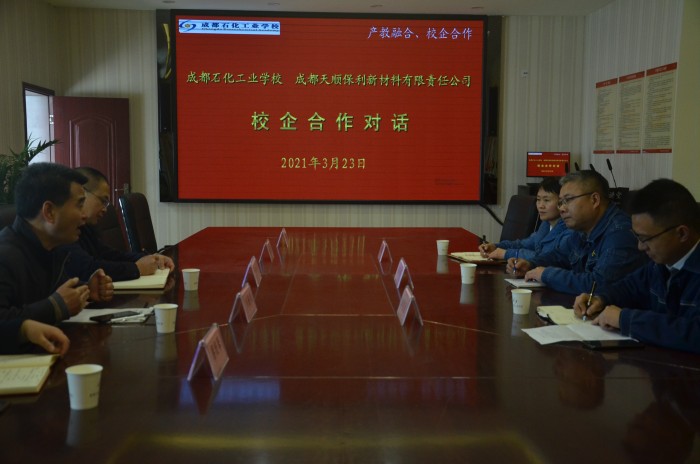 3月23日,我校与成都天顺保利新材料有限责任公司召开了校企合作对话会。成都天顺保利新材料有限责任公司生产部部长田小华、李清泉、人事部主管汝锋丽;我校党委副书记、工会主席段洪云,副校长刘遵勇,招生就业处主任杨旭,化工科教学相关负责同志参加了对话会。